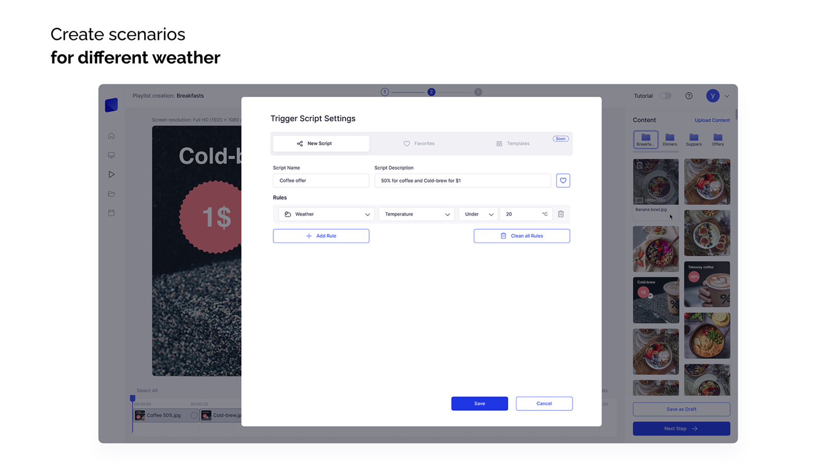 Adjust your digital content and special offers to your customers according to current weather: temperature, precipitation, humidity, etc