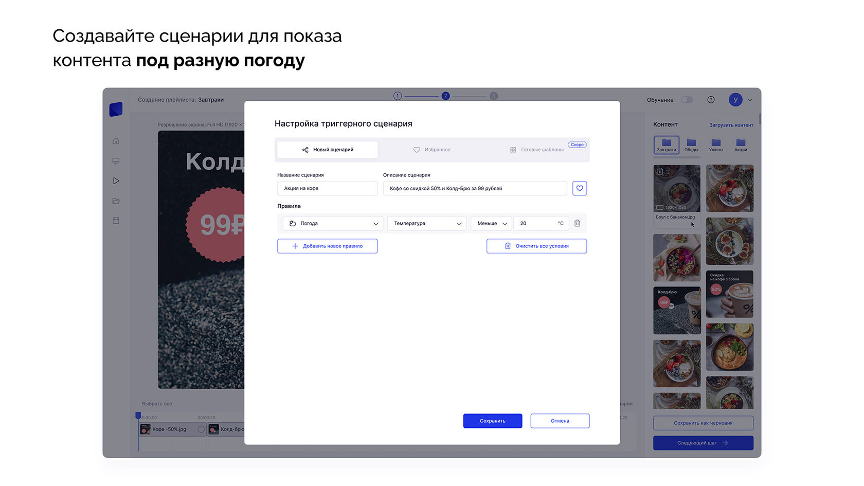 Можно настроить правила показа предложений и акций для клиентов в зависимости от погоды, температуры, осадков, ветра, влажности на улице