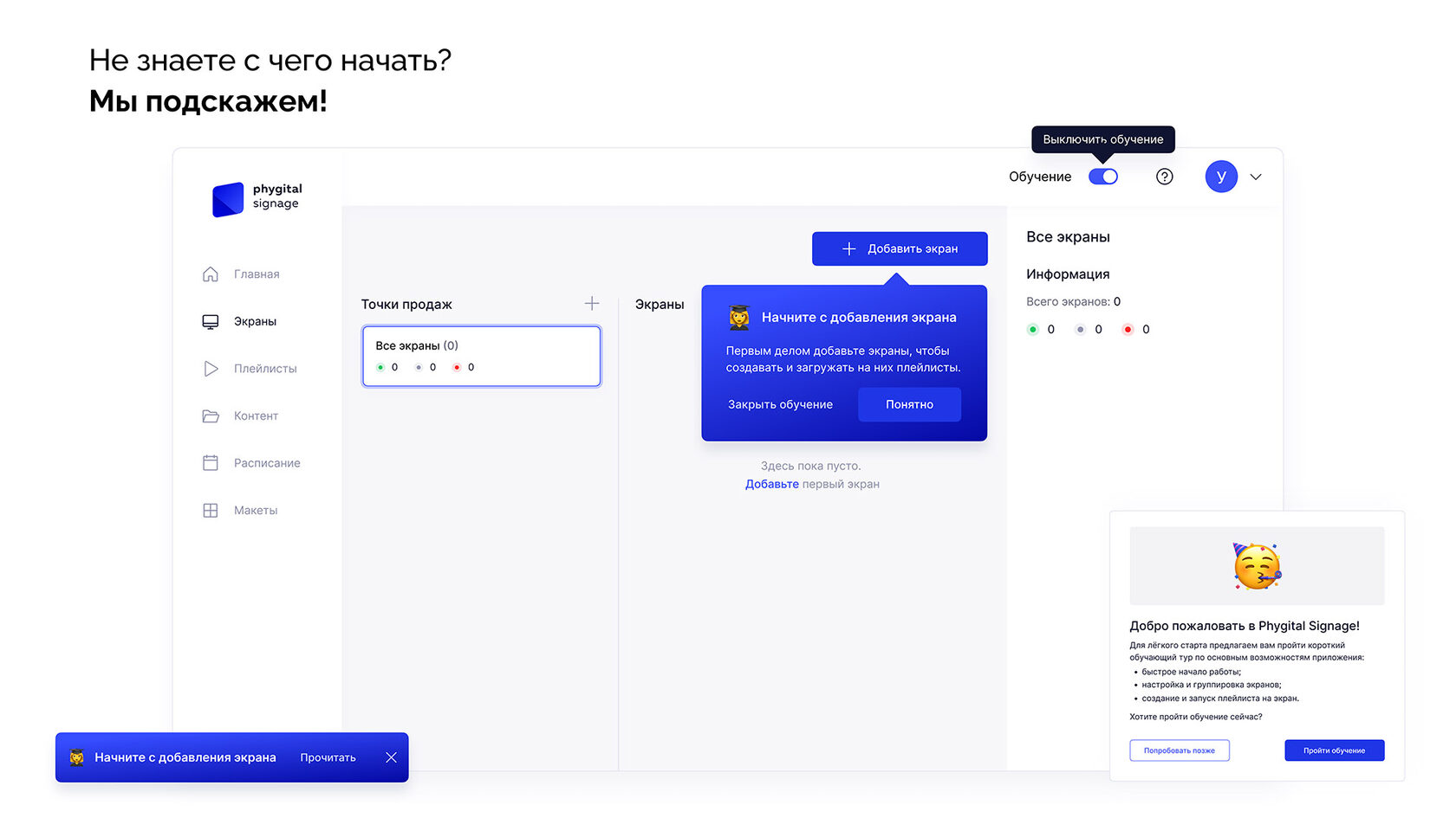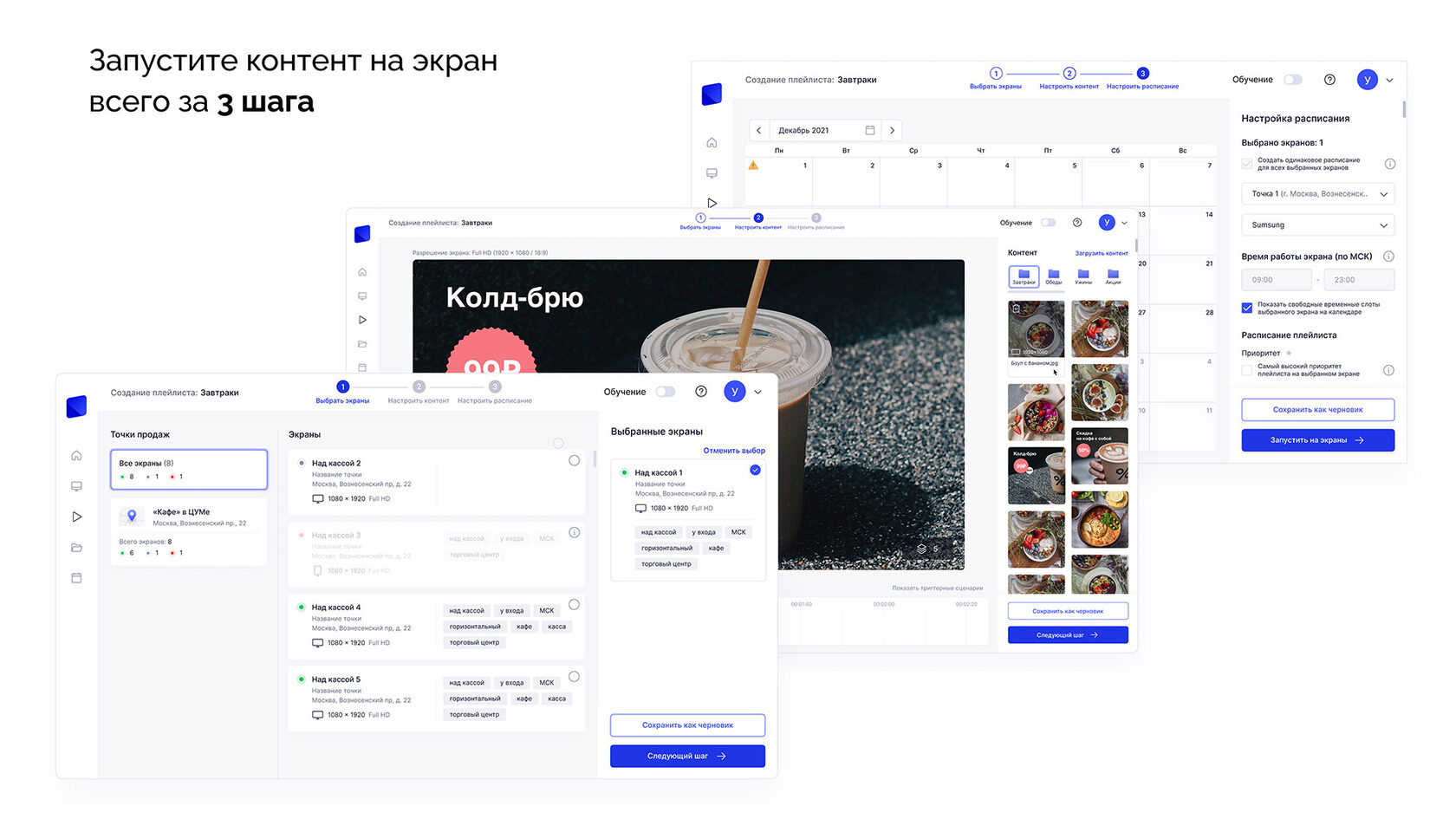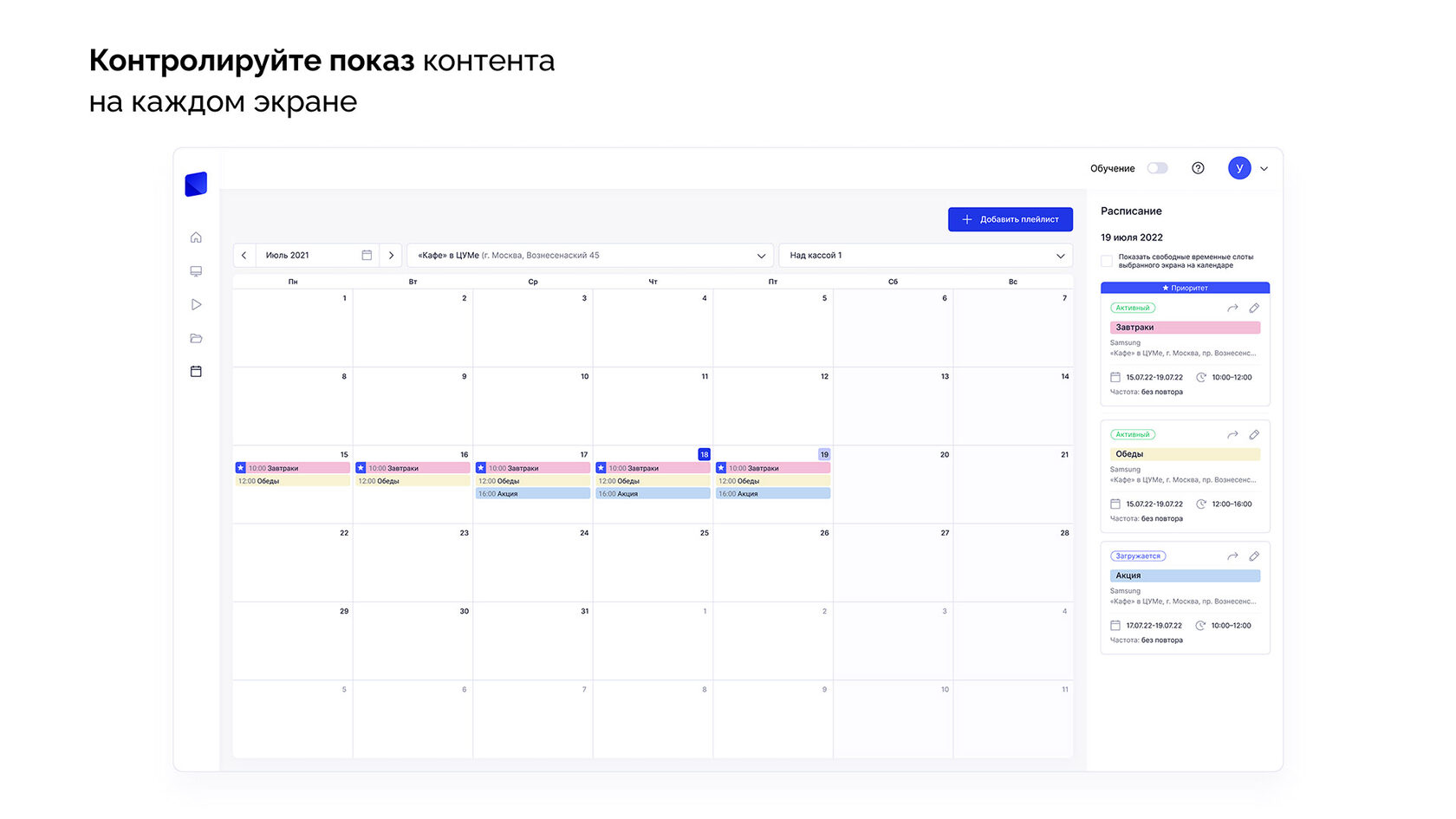 Загружайте видео, анимированные, статичные анонсы акций, новинок, спецпредложений в самых популярных форматах и удобно управляйте ими через плейлисты для проигрывания